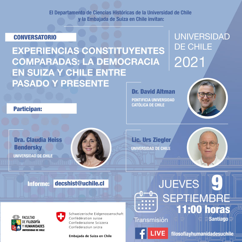 El Departamento de Ciencias Históricas y la Embajada de Suiza en Chile invitan al conversatorio “Experiencias constituyentes comparadas: la democracia en Suiza y Chile entre pasado y presente” en el cual participarán la Dra. Claudia Heiss Bendersky (U. de Chile), el Dr. David Altman (PUC) y el Lic. Urs Ziegler (U. de Chile).
