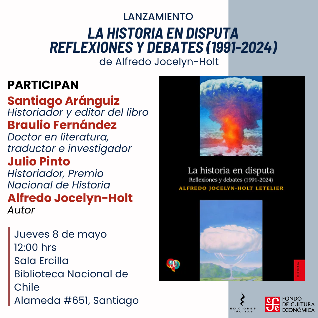 Ediciones Tácitas y Fondo de Cultura Económica invitan al lanzamiento del libro La historia en disputa: reflexiones y debates (1991-2024) de Alfredo Jocelyn-Holt, actividad que tendrá lugar en la Sala Ercilla de la Biblioteca Nacional el jueves 8 de mayo a las 12:00 horas.