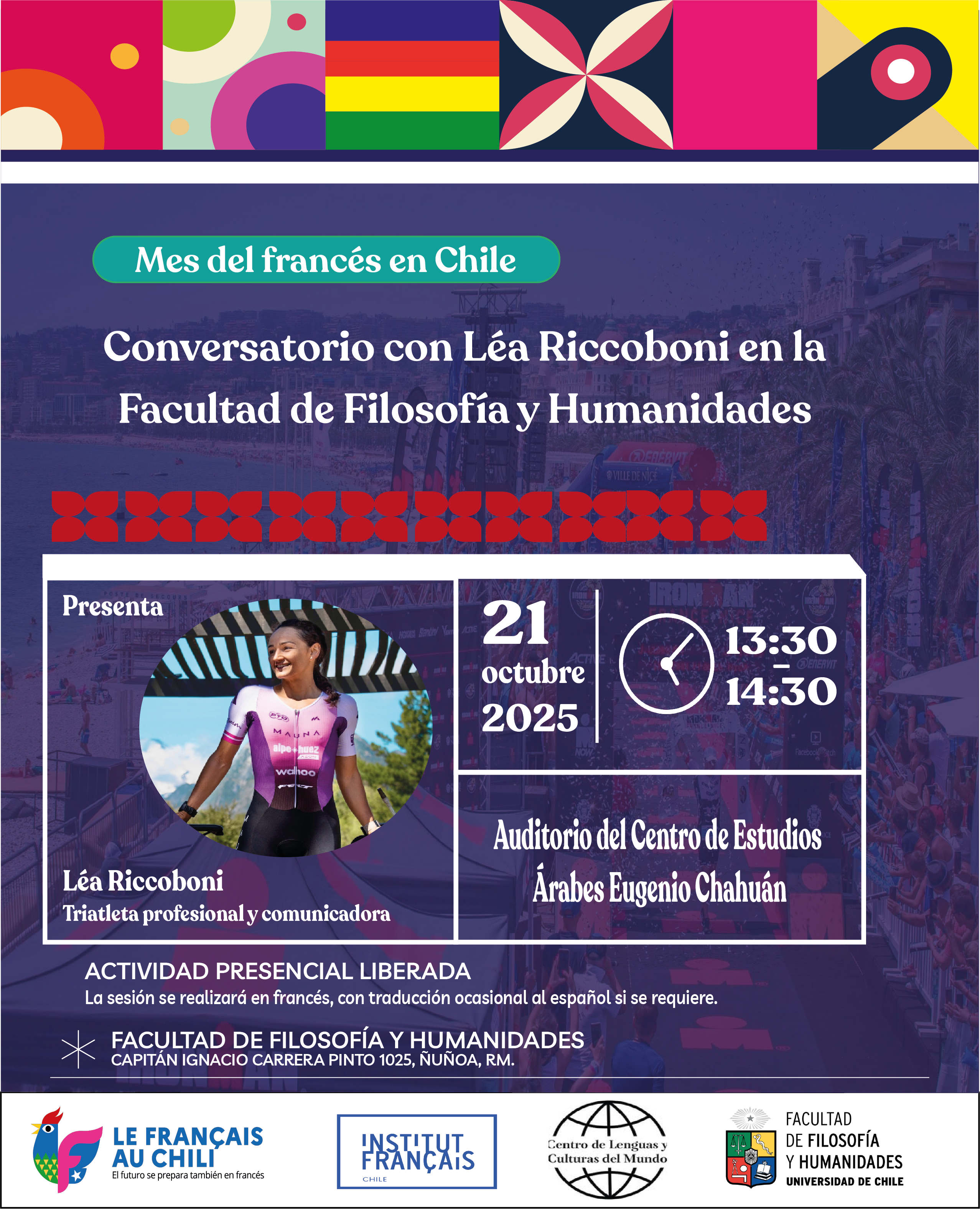 El Centro de Lenguas y Culturas del Mundo, junto a la Dirección de Relaciones Internacionales de la Facultad de Filosofía y Humanidades, invitan al conversatorio con la triatleta profesional y comunicadora Léa Riccoboni, en el marco del Mes del Francés en Chile, organizado por el Instituto Francés de Chile.