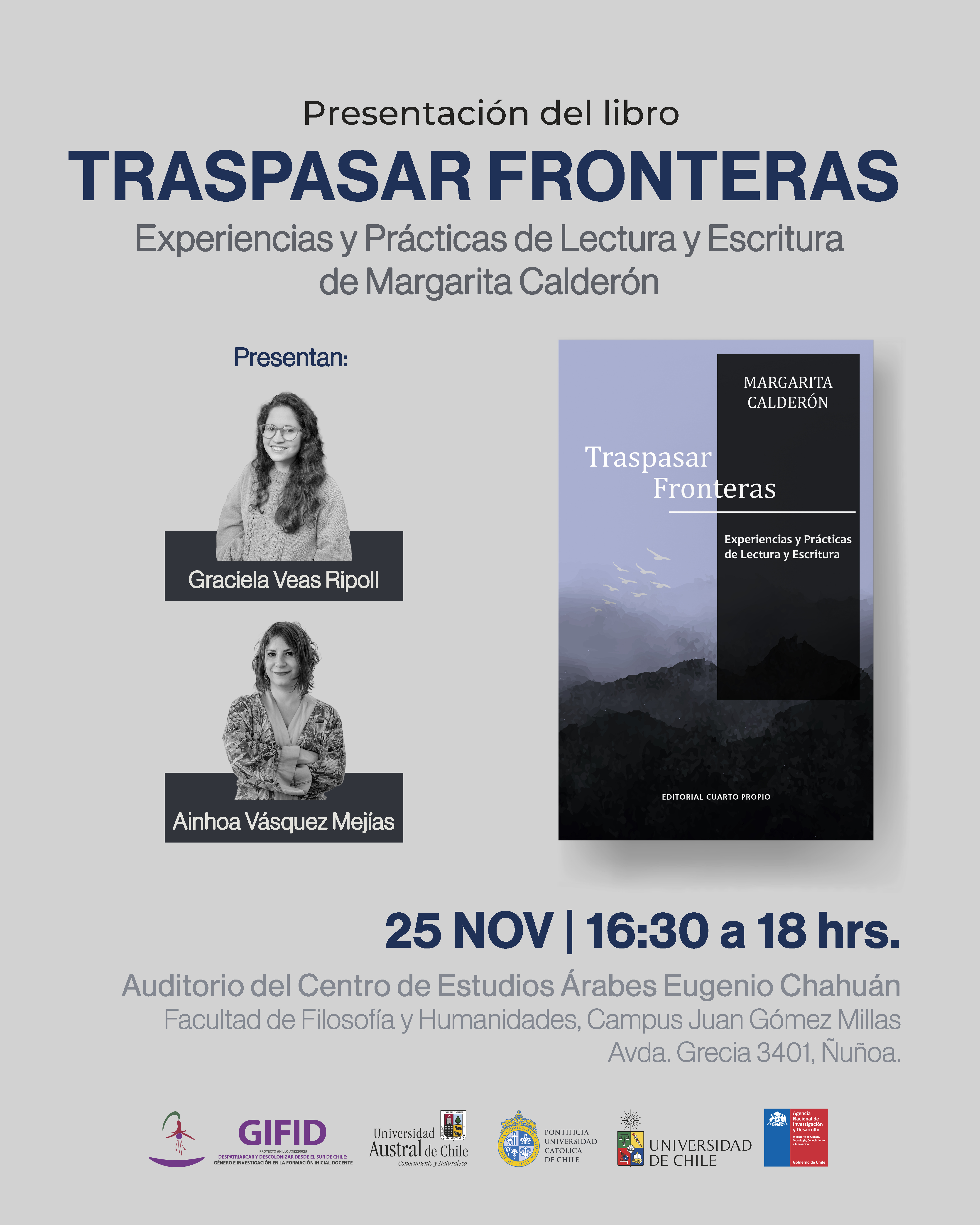 Editorial Cuarto Propio y la Facultad de Filosofía y Humanidades de la Universidad de Chile invitan al lanzamiento del libro Traspasar Fronteras. Experiencias y prácticas de lectura y escritura de Margarita Calderón López, académica del Departamento de Estudios Pedagógicos de la Universidad de Chile.