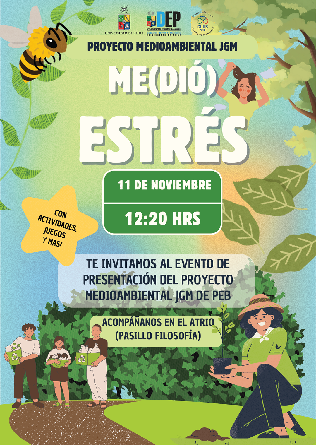 La Generación 2024 de la carrera de Pedagogía en Educación Básica de la Universidad de Chile, junto a la profesora Karin González, invitan al evento final del Proyecto Medioambiental: Me(dio) Estrés