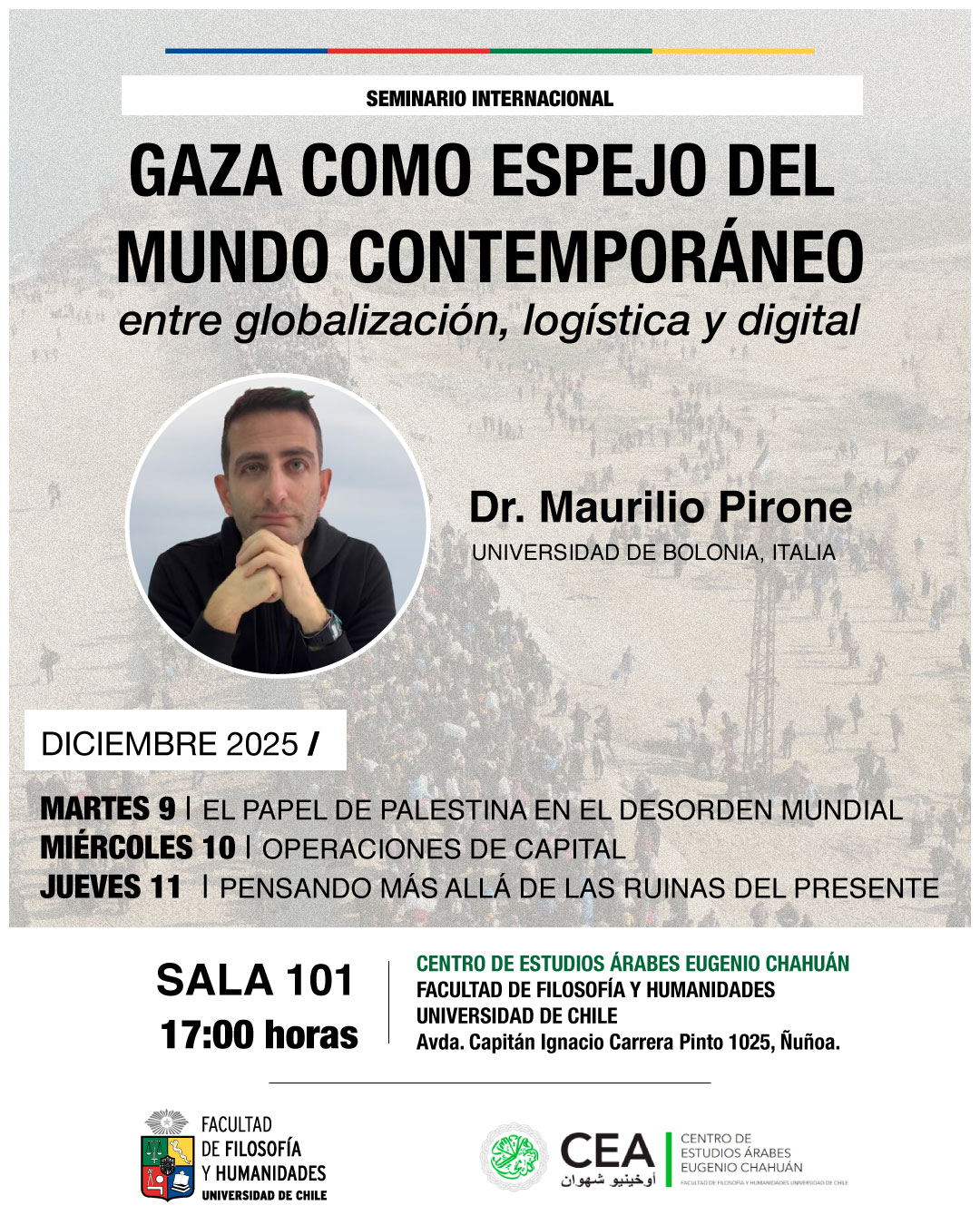El Centro de Estudios Árabes Eugenio Chahuán de la Facultad de Filosofía y Humanidades de la Universidad de Chile invita al Seminario Internacional "Gaza como espejo del mundo contemporáneo. Entre globalización, logística y digital", a cargo del Dr. Maurilio Pirone de la Universidad de Bolonia, Italia.