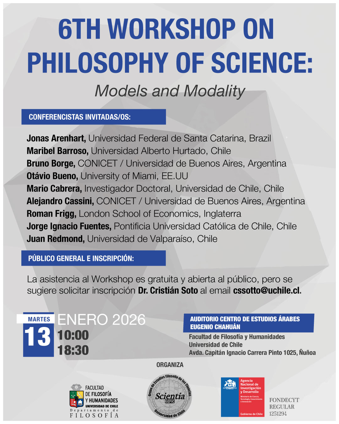 El Grupo de Estudios de Filosofía de las Ciencias de la Universidad de Chile invita al 6th Workshop on Philosophy of Science (WPS): Models and Modality. Los modelos juegan un rol clave en la distintas prácticas científicas, facilitando labores asociadas a la explicación, predicción y representación de diversos fenómenos. La filosofía de las ciencias ha llevado a cabo esfuerzos sostenidos por entender, entre otras cosas, las maneras en las cuales los modelos pueden representar sus fenómenos. Más recientemente, se ha prestado particular atención al hecho de que muchos modelos incorporan elementos tales como idealizaciones y abstracciones que los tornan inevitablemente falsos si se los quiere leer literalmente como representaciones de sus dominios de ionterés. Poco a poco se ha llegado a reconocer que los modelos exitosos no necesariamente llevan a cabo labores representacionales, sino de otro tipo – lo cual tiene que ser determinado caso a caso. El presente workshop pretende ir más allá, explorando el hecho peculiar de que algunos modelos son modalmente informativos. Esto quiere decir que algunos modelos, incluso si no representan directamente sus dominios, ofrecen información acerca de posibilidades, imposibilidades o necesidades relevantes en sus dominios respectivos. Algunas de las preguntas filosóficas que emergen ante ello son las siguientes: ¿pueden los modelos, aún si no son representaciones, ofrecer información modal acerca de sus dominios de interés? Y si ese es el caso, ¿es la modalidad en cuestión meramente epistémica u ontológica? En el primer caso, la modalidad se predica acerca de (usualmente probabilidades subjetivas) de estados de creencias; en el segundo caso, en cambio, la modalidad se predica acerca de la constitución del dominio de interés. La estrategia del modelamiento modal lleva solo unos pocos años siendo desarrollada e invita a plantear varios problemas no siempre abordados por el debate estándar sobre modelos y representación científica.