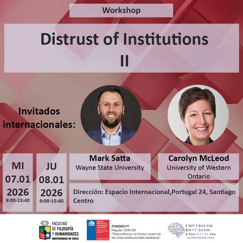 El Departamento de Filosofía y el Centro de Estudios Cognitivos de la Facultad de Filosofía y Humanidades de la Universidad de Chile invitan al segundo workshop Distrust of Institutions, que tendrá lugar en Santiago de Chile los días 7 y 8 de enero de 2026. Esta actividad es parte del proyecto ANID FONDECYT 1230128: Desconfianza en las instituciones: Un factor causal de las crisis institucionales searleanas.