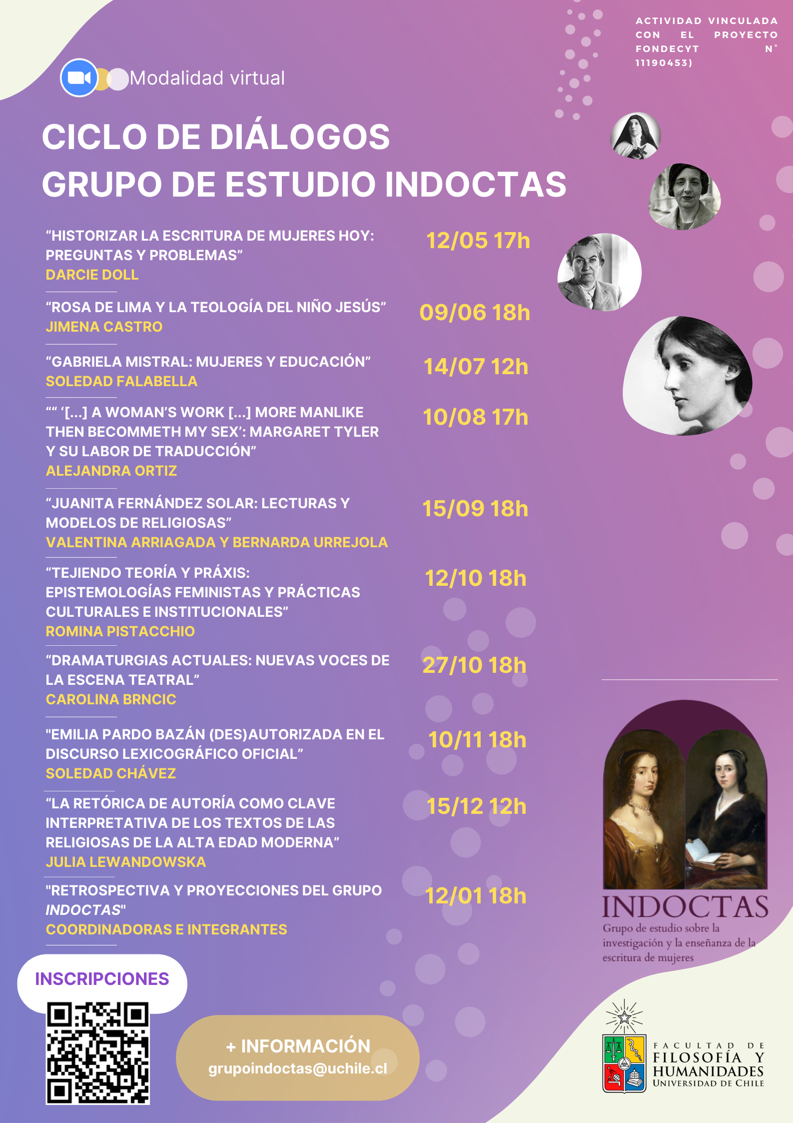 Indoctas nace en el Departamento de Literatura de la Facultad de Filosofía y Humanidades, pero quiere generar un espacio de diálogo en el que profesoras/es, académicas/os, investigadoras/es y estudiantes provenientes de distintas áreas de la Humanidades (literatura, filosofía, lingüística, historia, pedagogía, etc.) dialoguemos y reflexionemos desde una perspectiva crítica sobre el estudio, la investigación y la enseñanza de las mujeres, su escritura y su pensamiento, entendiendo lo “indocto” como un problema, como una tensión que debe ser observada críticamente y con atención, para no caer en simplificaciones o binarismos. Al mismo tiempo, el grupo pretende abrir y promover estas reflexiones en otros ámbitos distintos al universitario, manteniendo un vínculo constante de sus actividades con la extensión.