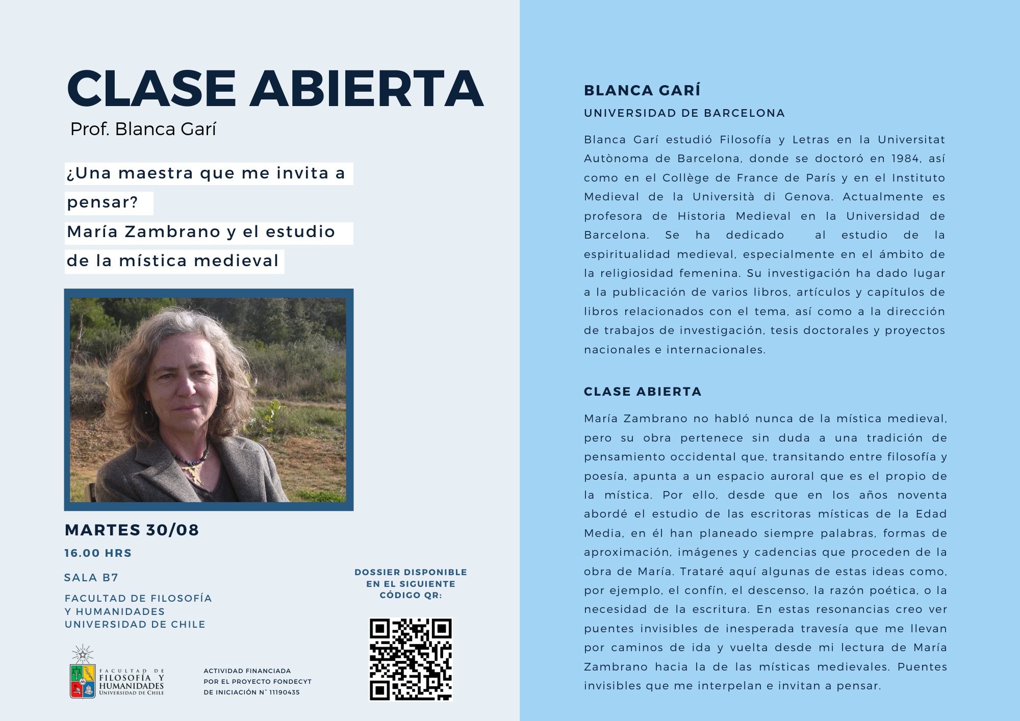 La profesora Garí ha dedicado parte fundamental de su trayectoria académica al estudio, traducción y publicación de las obras de las escritoras místicas de la edad media. Su visita se enmarca en la ejecución del proyecto Fondecyt de Iniciación (11190435) del cual la profesora Daniela Picón, académica del Departamento de Literatura de la U. de Chile, es investigadora responsable. Para la profesora Picón “resulta emocionante recibir en nuestra Facultad a Blanca, pues sus estudios sobre las místicas han desentrañado aspectos fundamentales de la identidad femenina medieval y cómo estas mujeres nos interpelan en el presente. Gracias a su visita, tendremos la oportunidad de escucharla y dialogar personalmente con ella”.