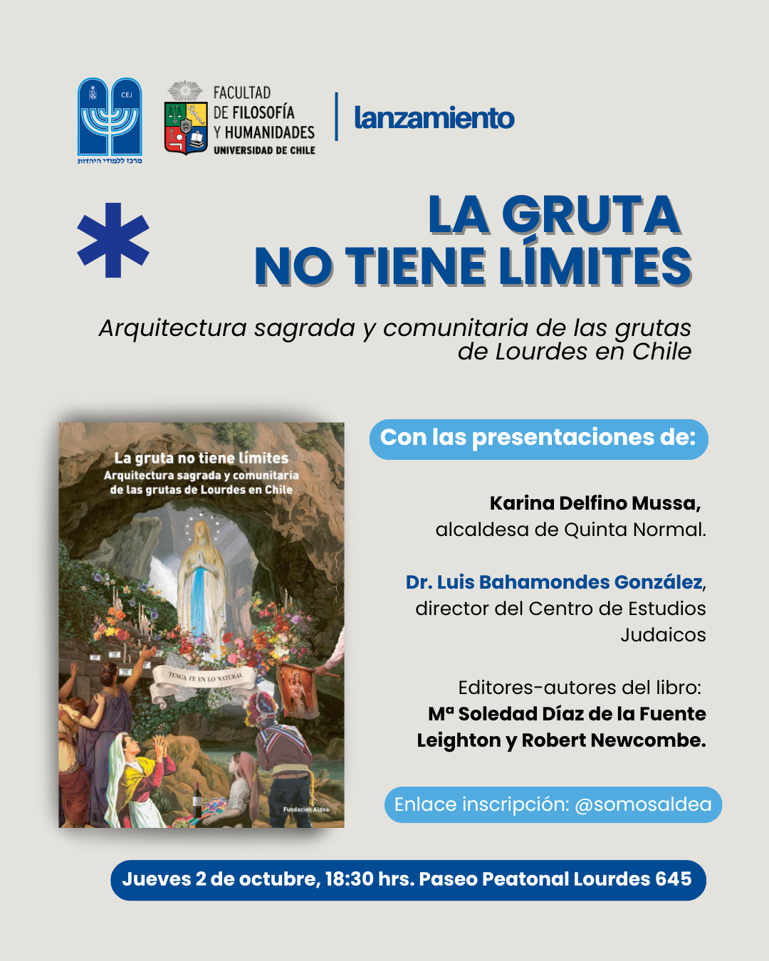 La Fundación Aldea invita a la comunidad a la presentación del libro La gruta no tiene límites. Arquitectura sagrada y comunitaria de las grutas de Lourdes en Chile, que tendrá lugar el próximo jueves 2 de octubre a las 18:30 horas en la Gruta de Lourdes de Quinta Normal (Paseo Peatonal Lourdes 645).