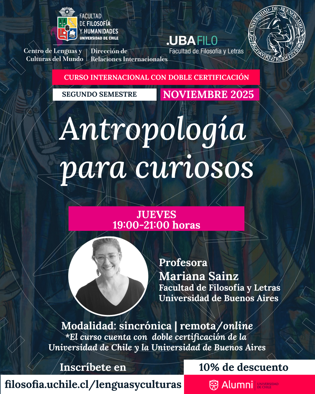 Por su parte, el curso Antropología para curiosos, invita a navegar por distintos momentos históricos de la Antropología Sociocultural para poder revisitar algunas de las problemáticas y discusiones centrales que la han distinguido. Indagar sobre las formas en que la Antropología ha construido su objeto privilegiado, la alteridad / la otredad, permitiendo reflexionar sobre algunos aportes conceptuales e interpelar las coordenadas con las que intervenimos en la vida diaria. Es una invitación a asumir una mirada desnaturalizadora y problematizadora de las tramas sociales, políticas, culturales, económicas e históricas que constituyen nuestro mundo contemporáneo. El curso estará a cargo de Mariana Sainz, antropóloga, graduada en la Facultad de Filosofía y Letras de la Universidad de Buenos Aires (FFyL-UBA). Cuenta con estudios de posgrado en la Especialización de Políticas Públicas de Niñez, Adolescencia y Familia (UNER) y en la Maestría de Políticas Sociales y Derechos Humanos (UNSAM) y es Diplomada en Educación Sexual Integral (FFyL-UBA).