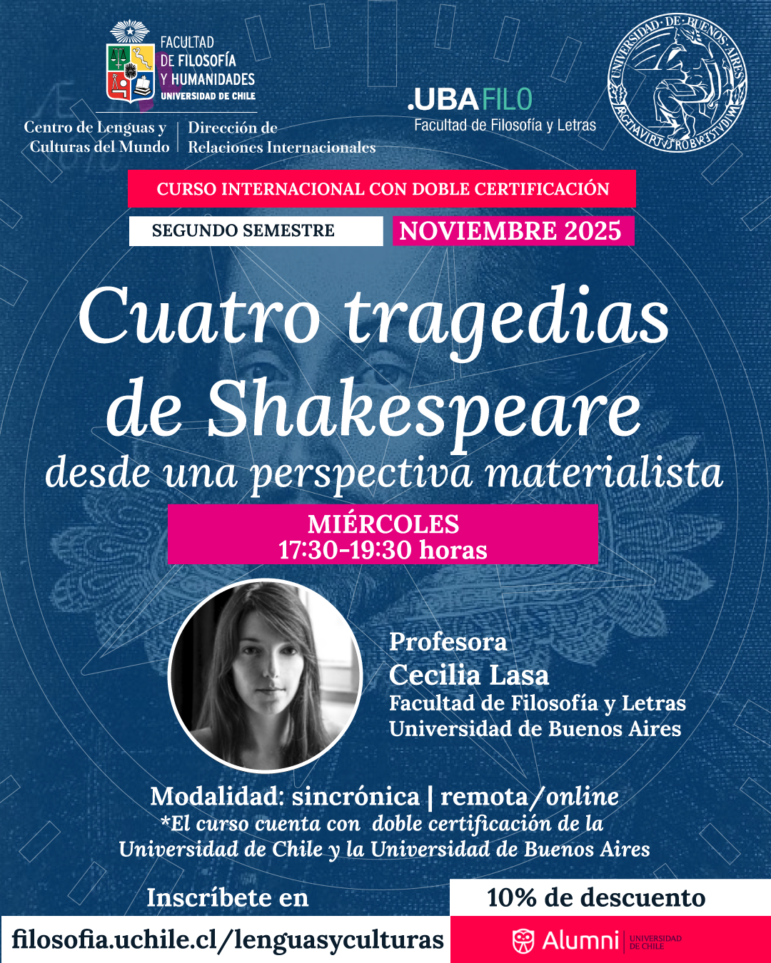 Siendo así, el curso Cuatro tragedias de Shakespeare desde una perspectiva materialista, que tiene por objetivo releer un corpus de cuatro tragedias shakespearianas (Macbeth, Hamlet, Romeo y Julieta y El rey Lear) desde una óptica materialista de forma tal de recuperar sentidos literarios e históricos de la Modernidad temprana inglesa que han sido desplazados por parte de la crítica. El curso será dictado por Cecilia Lasa, doctora en Letras por la Facultad de Filosofía y Letras de la Universidad de Buenos Aires (FFyL, UBA). Trabaja como docente e investigadora en las materias Literatura Inglesa y Literatura Norteamericana de la carrera de Letras en dicha casa de estudios.