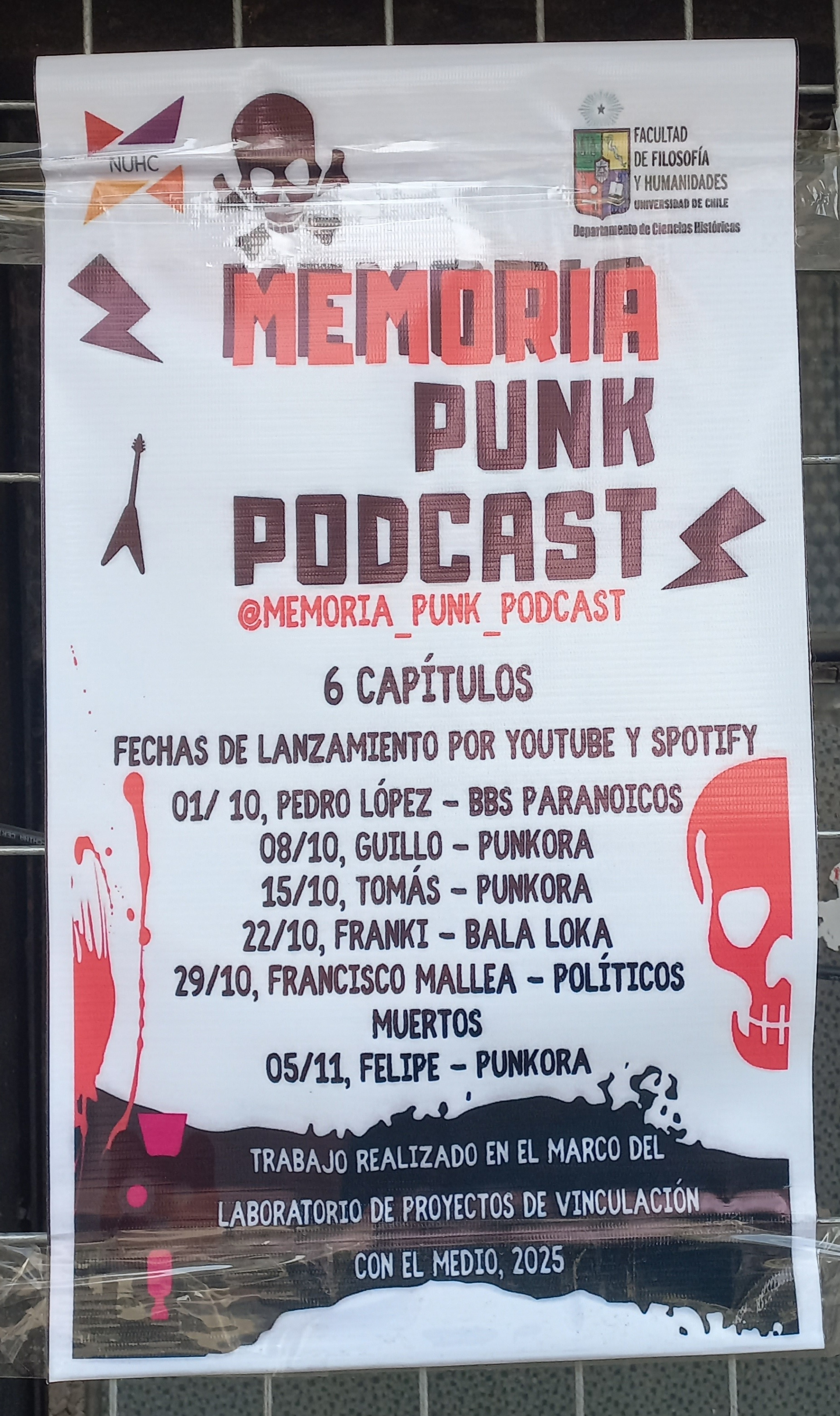 Explorar la historia reciente del país desde los márgenes culturales fue el propósito del proyecto “La memoria histórica de la transición a la democracia desde la visión de bandas de punk rock chileno”, mediante entrevistas, revisión de archivos y análisis de letras, los estudiantes rescataron cómo el punk se convirtió en un espacio de resistencia, denuncia y reflexión social durante la década de 1990. La propuesta buscó difundir esta memoria alternativa y visibilizar su aporte a la construcción de una cultura crítica en Chile, culminando en un podcast de 6 capítulos difundidos en Spotify, y una cuenta de Instagram que alcanzó cerca de doce mil visualizaciones. Este proyecto fue desarrollado por Felipe Cisternas Vásquez, Javiera Córdova Castillo, Nicolás Toro Aránguiz y Martín Gallardo Ibáñez.